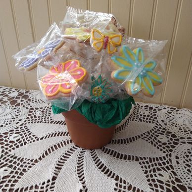 Brighten someone's day! Instead of real flowers, how about a surprise bouquet of cookie flowers. These come in a flower pot and has 6-8 cookies. Accented with birds or butterflies to add some fun. Don't forget secretary appreciation, birthdays, anniversaries, or just a good friend, etc.