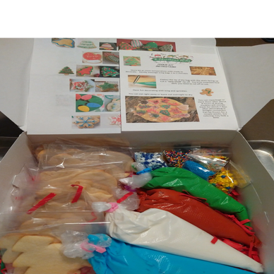 The box includes baked cookies, icing, sprinkles, instructions and sample designs.
